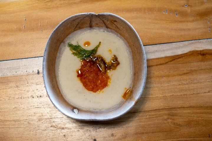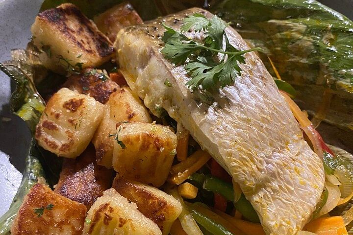 - Cabrito Fish wrapped in bijao leaves, with yuca gnocchi